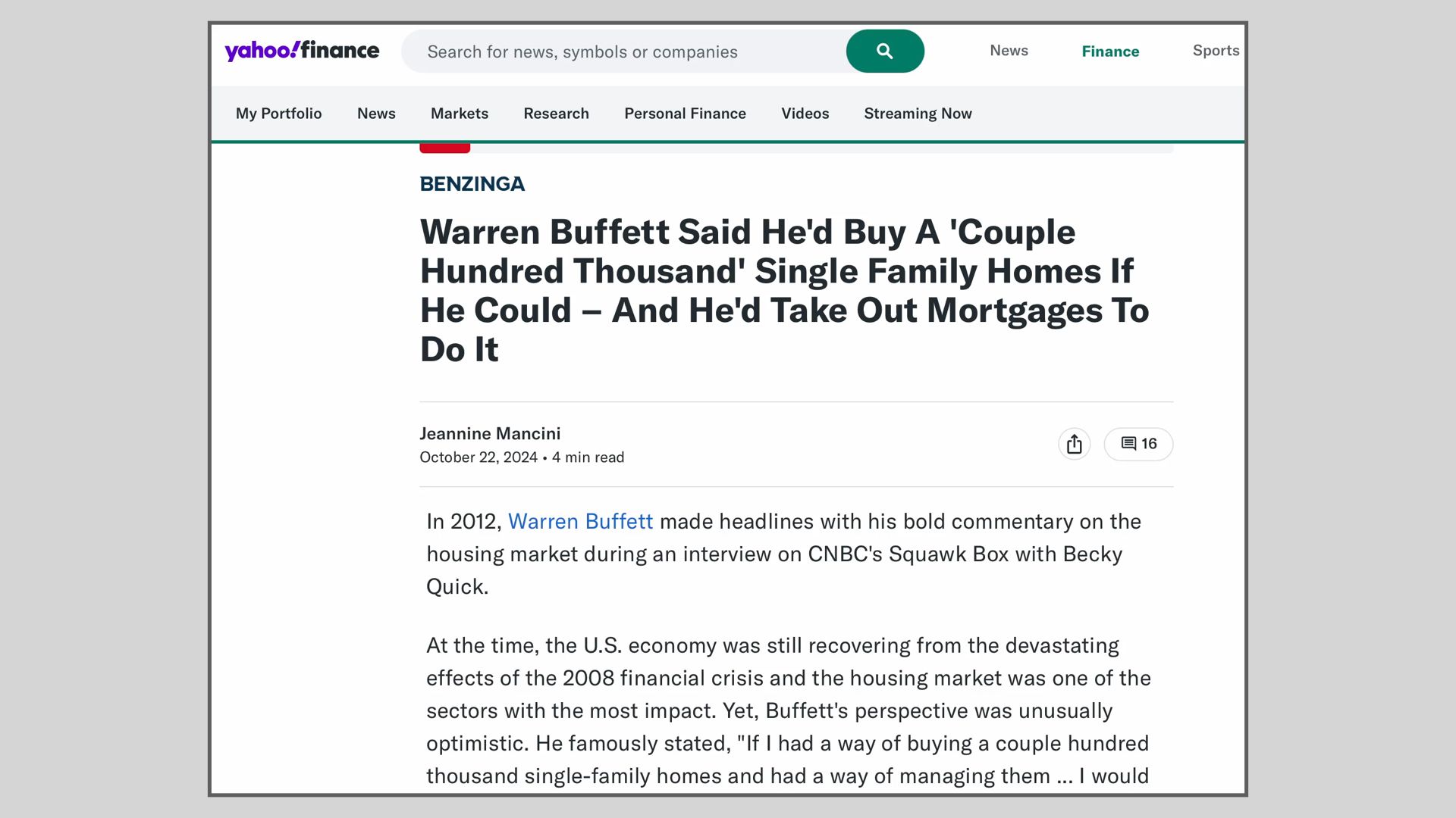 Back in 2012, when the economy was STILL shuddering under the effects of the 2008 banking collapse, Buffet himself said he would go buy "a couple hundred thousand" homes-- in the middle of that economic wasteland-- if he could.
